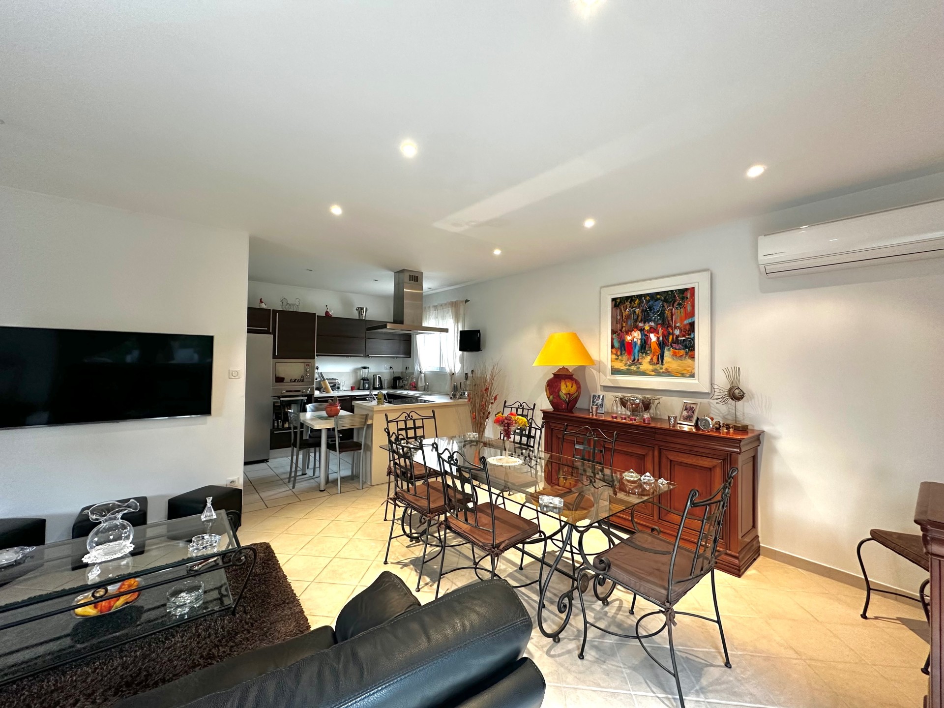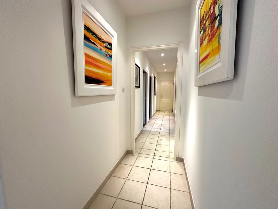 L'entrée, dotée de placards muraux, mène à une cuisine meublée et équipée, très fonctionnelle, semi-ouverte sur un vaste salon-séjour lumineux de 40 m², grâce à deux baies vitrées donnant chacune sur des terrasses.