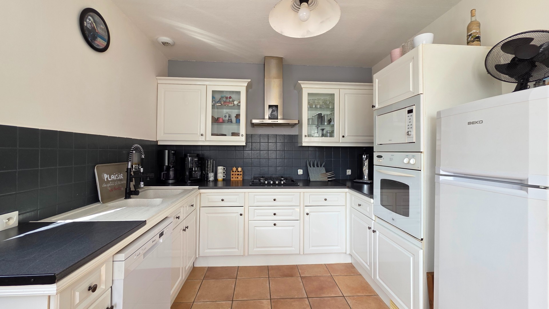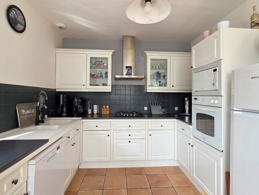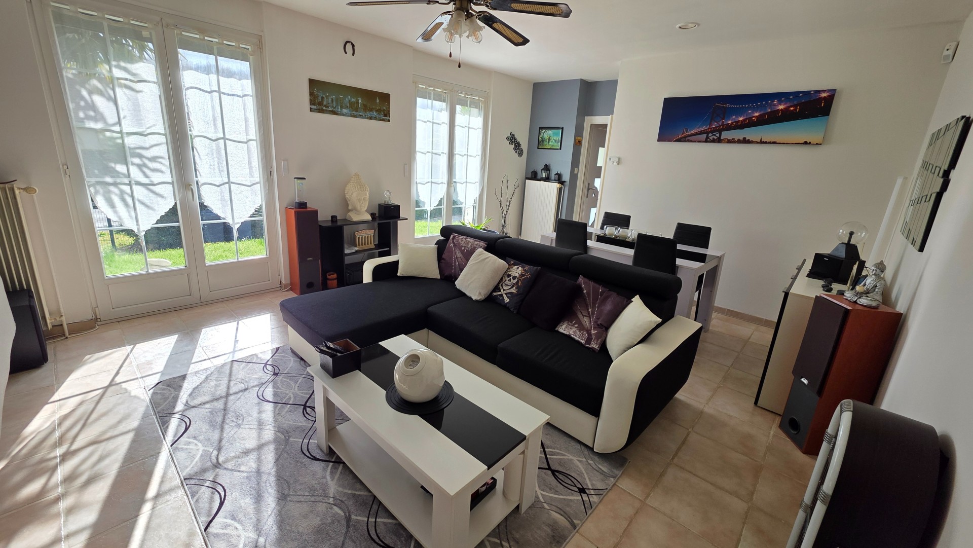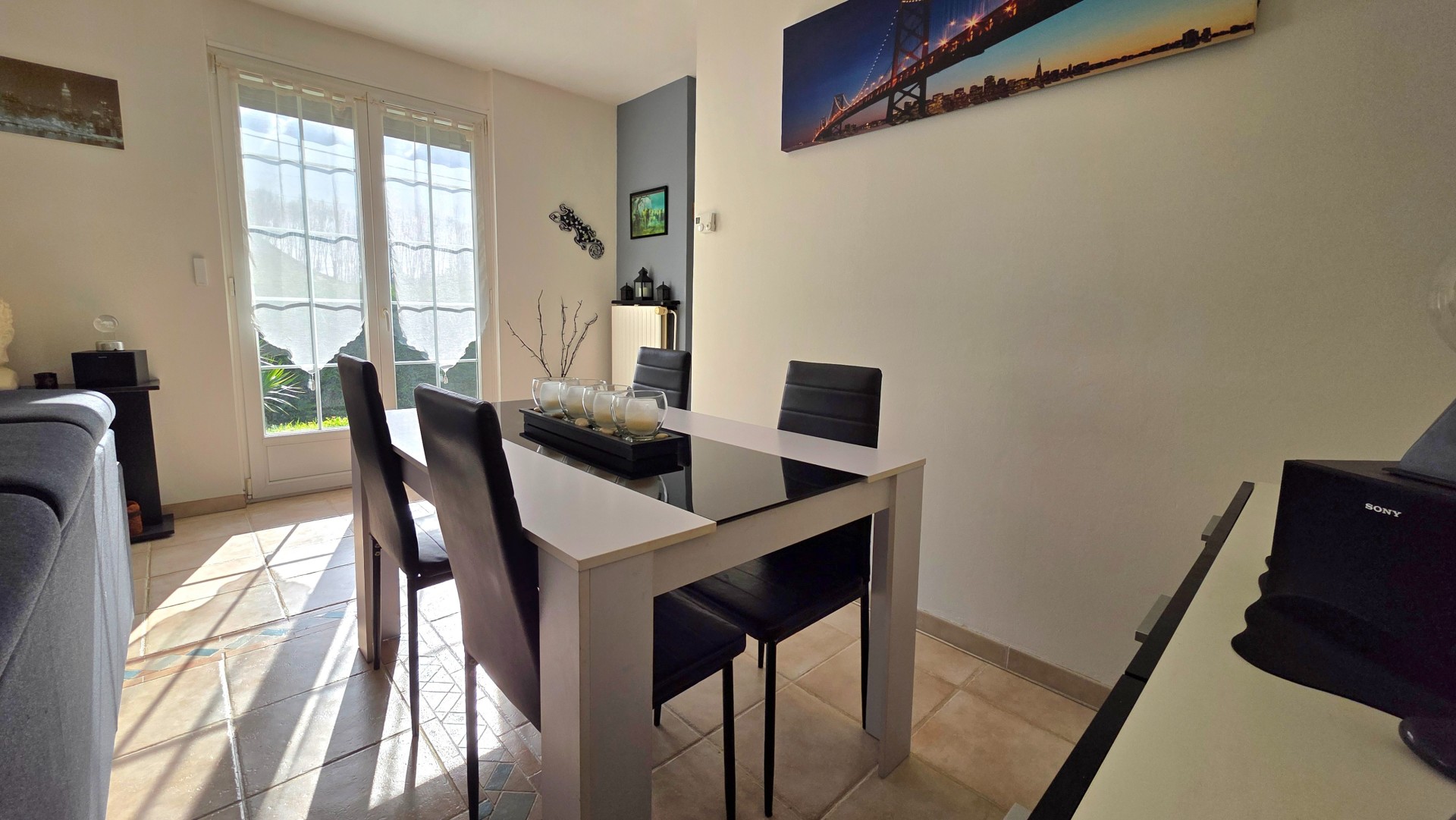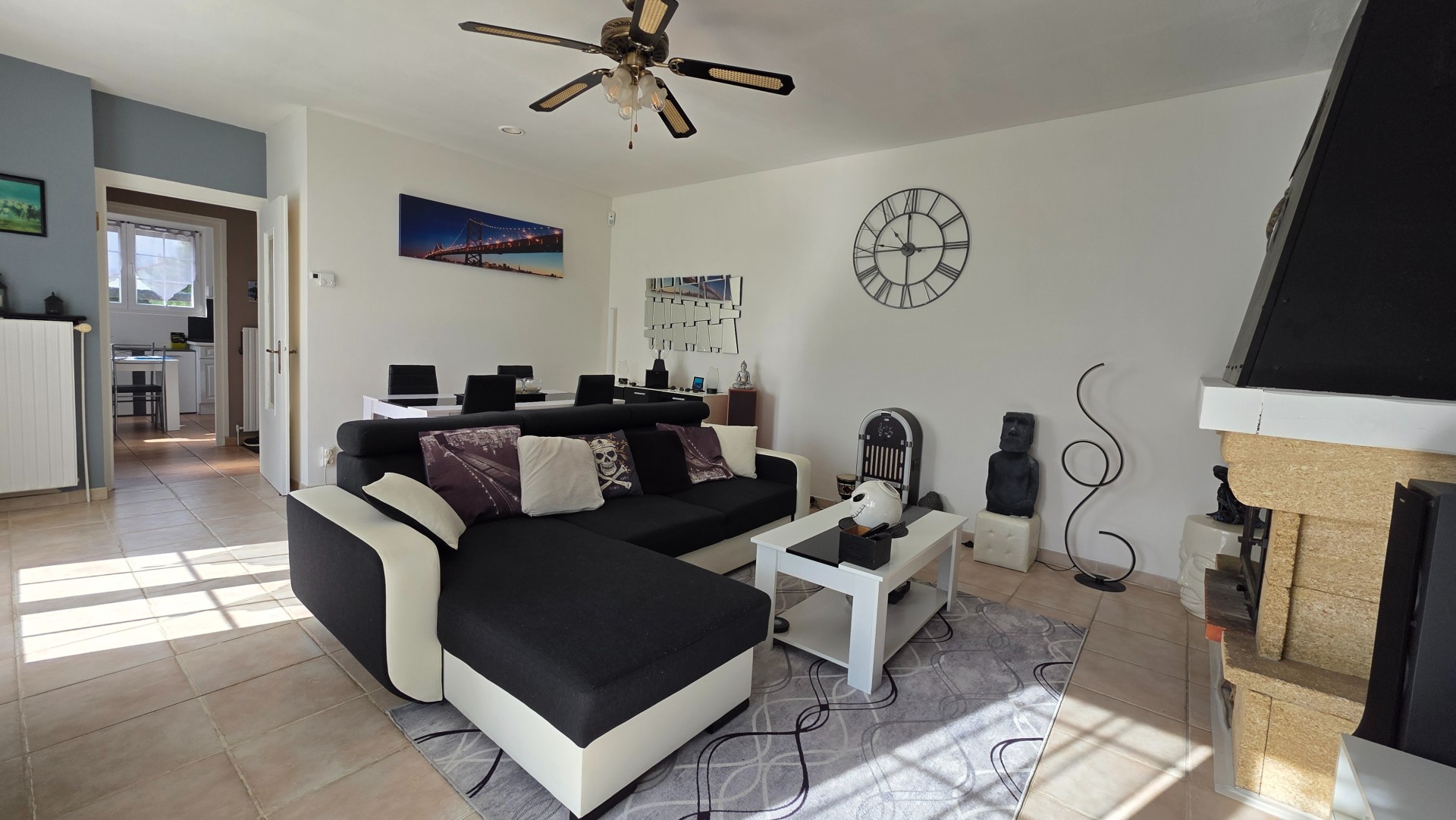 D?une surface habitable d'environ 90 m², cette maison lumineuse et bien agencée s'ouvre sur un hall d'entrée desservant une cuisine semi-équipée avec espace repas de 13,29 m², fonctionnelle et baignée de lumière. Dans son prolongement, un salon / séjour chaleureux de 25 m² avec insert bois bénéficie de deux portes-fenêtres donnant directement accès à l'extérieur, apportant une belle luminosité.