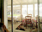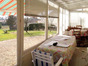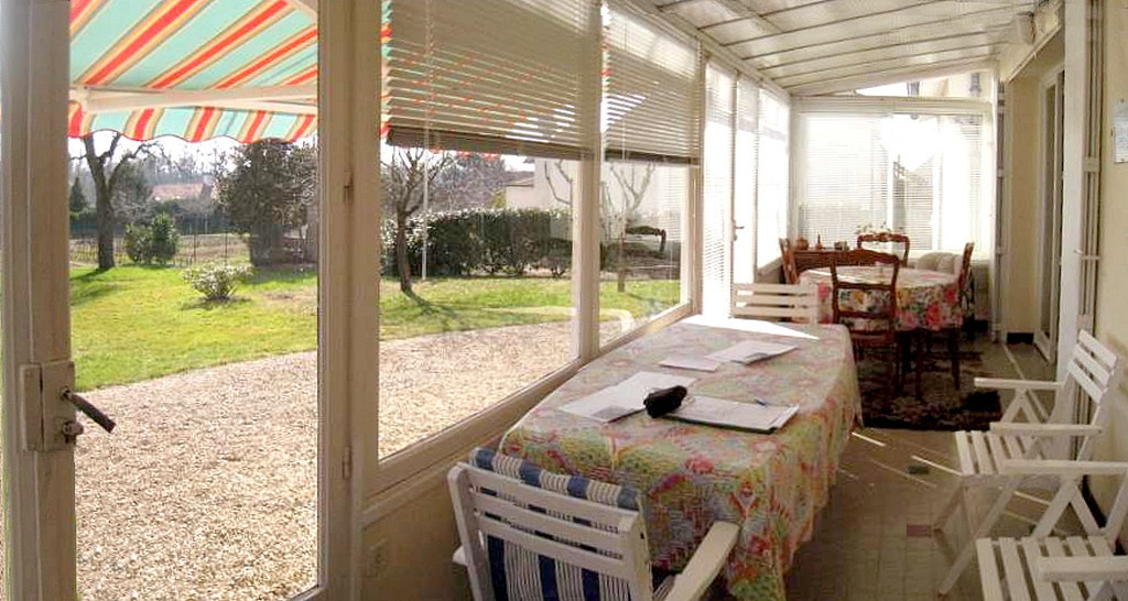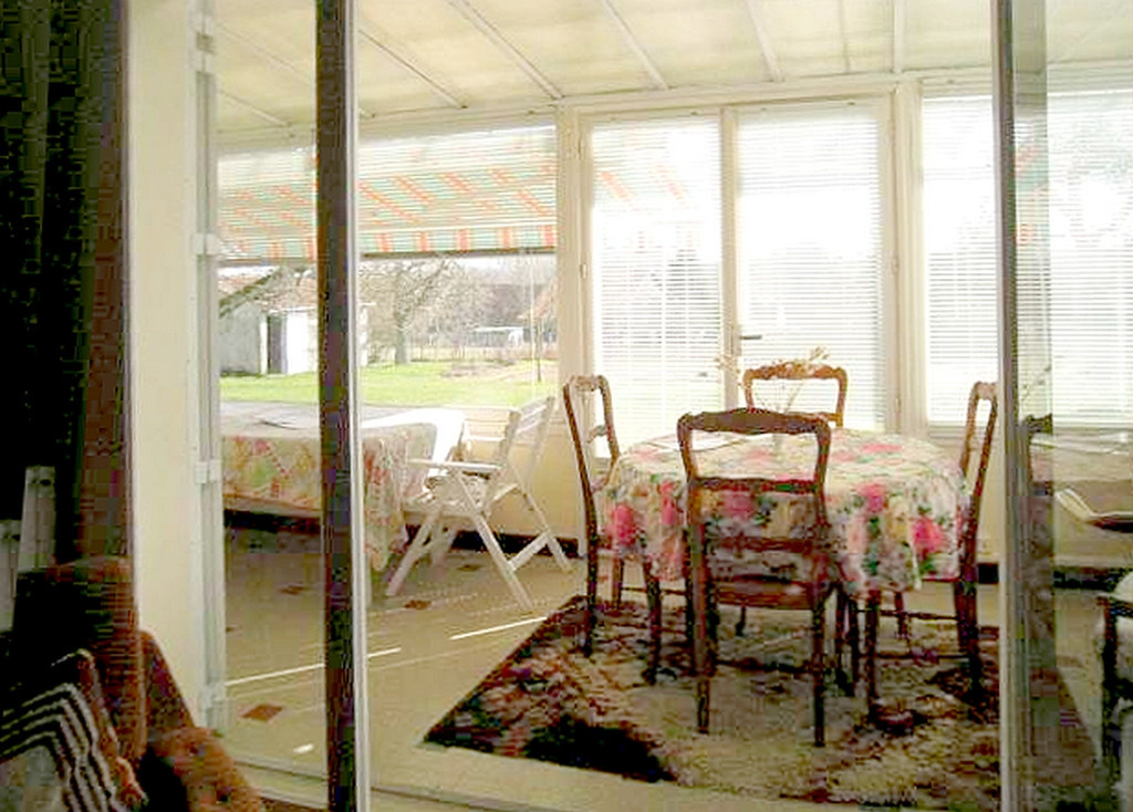 La véranda, en façade à gouttereau arrière, donne par deux baies vitrées, sur un agréable terrain clos de 1 550 m² sans vis-à-vis. Au fond du jardin se trouvent un puits et un petit atelier dont l'issue est sécurisée avec des barreaux de protection pour protéger l'accès à d'une cave enterrée dessous.