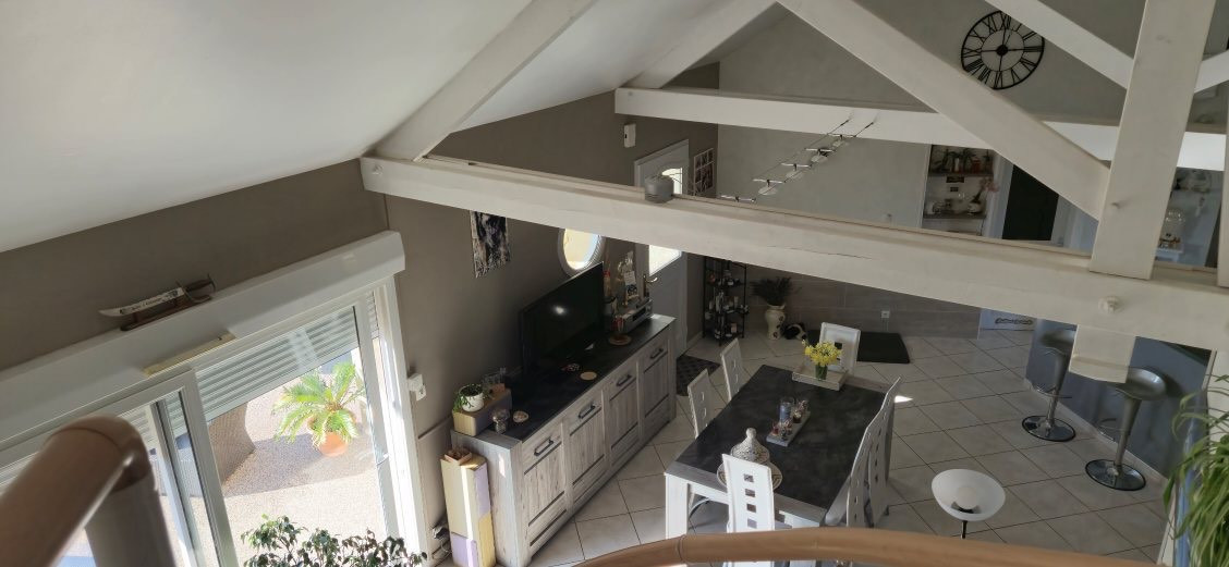Elle se compose au rez-de-chaussée d'une cuisine américaine équipée et aménagée ouverte sur une salle à manger/séjour disposant d'un plafond cathédrale. D'un côté, un espace nuit est constitué de trois chambres, une salle de bain/douche et un WC 1.