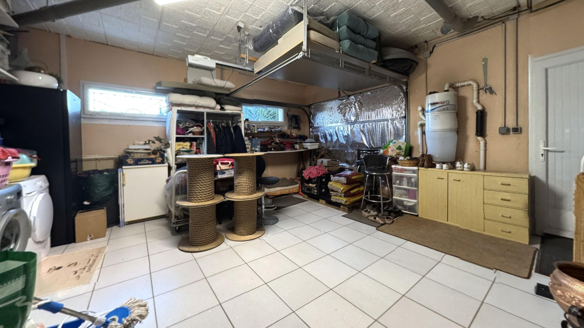 Une grande buanderie-espace de rangement est aménagée dans un garage avec portail automatisé qui pourrait reprendre sa fonction.