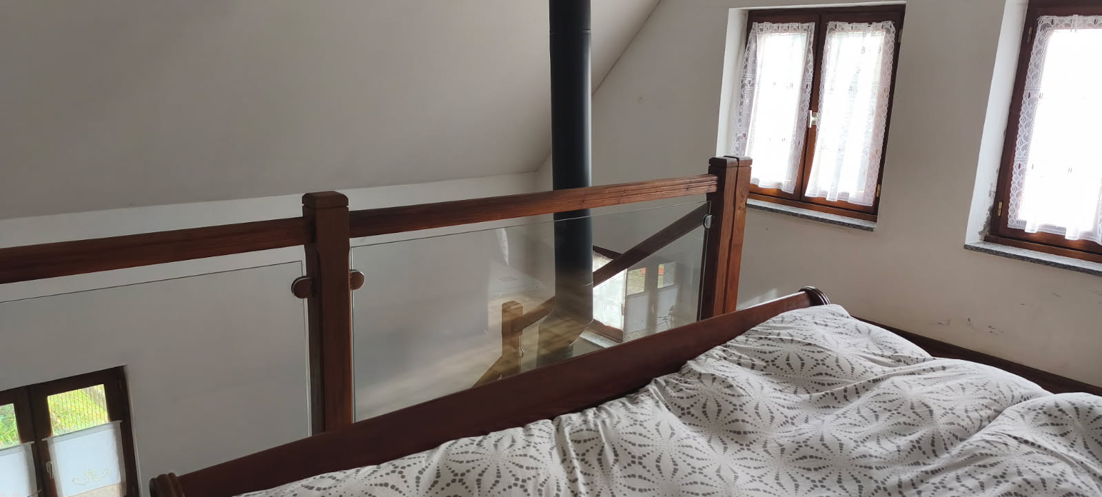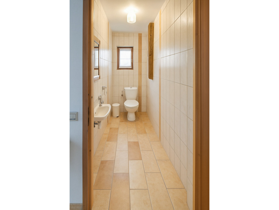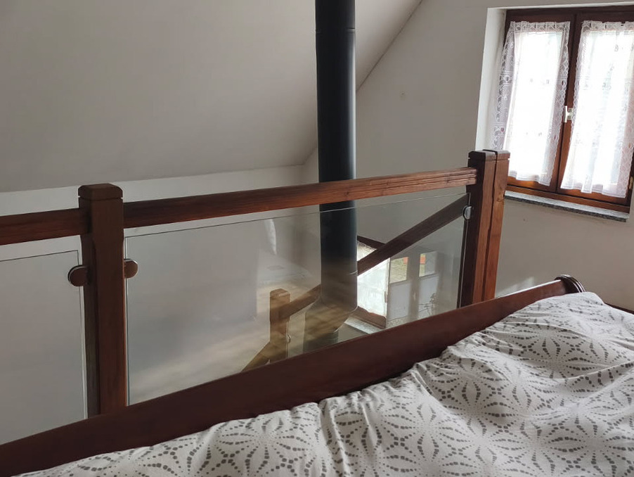 On ressort de ce séjour par une porte ouvrant sur l'espace nuit déjà spécifié. Celui-ci est composé d'une pièce disposant d'un placard de rangement avec un cumulus de 200 litres, d'une salle d'eau avec douche dont le sol est composé d'un assemblage d'incroyables carreaux en granits de diverses tailles et de toutes provenances (gris, noir, rose, blanc, jaune...), et d'un WC indépendant. La pièce elle-même accueille en son centre un ancien poêle à bois alsacien à accumulation de chaleur de style Napoléon III en carreaux faïence de couleur verte, qui a été superbement restauré à neuf par un spécialiste. Ce poêle permet de chauffer toute la partie nuit, et notamment une deuxième chambre qui est située, comme un duplex, dans une grande mezzanine accessible par un escalier en bois quart-tournant. Depuis cette mezzanine, il est possible de pénétrer dans un immense grenier aménageable pouvant constituer deux chambres supplémentaires.