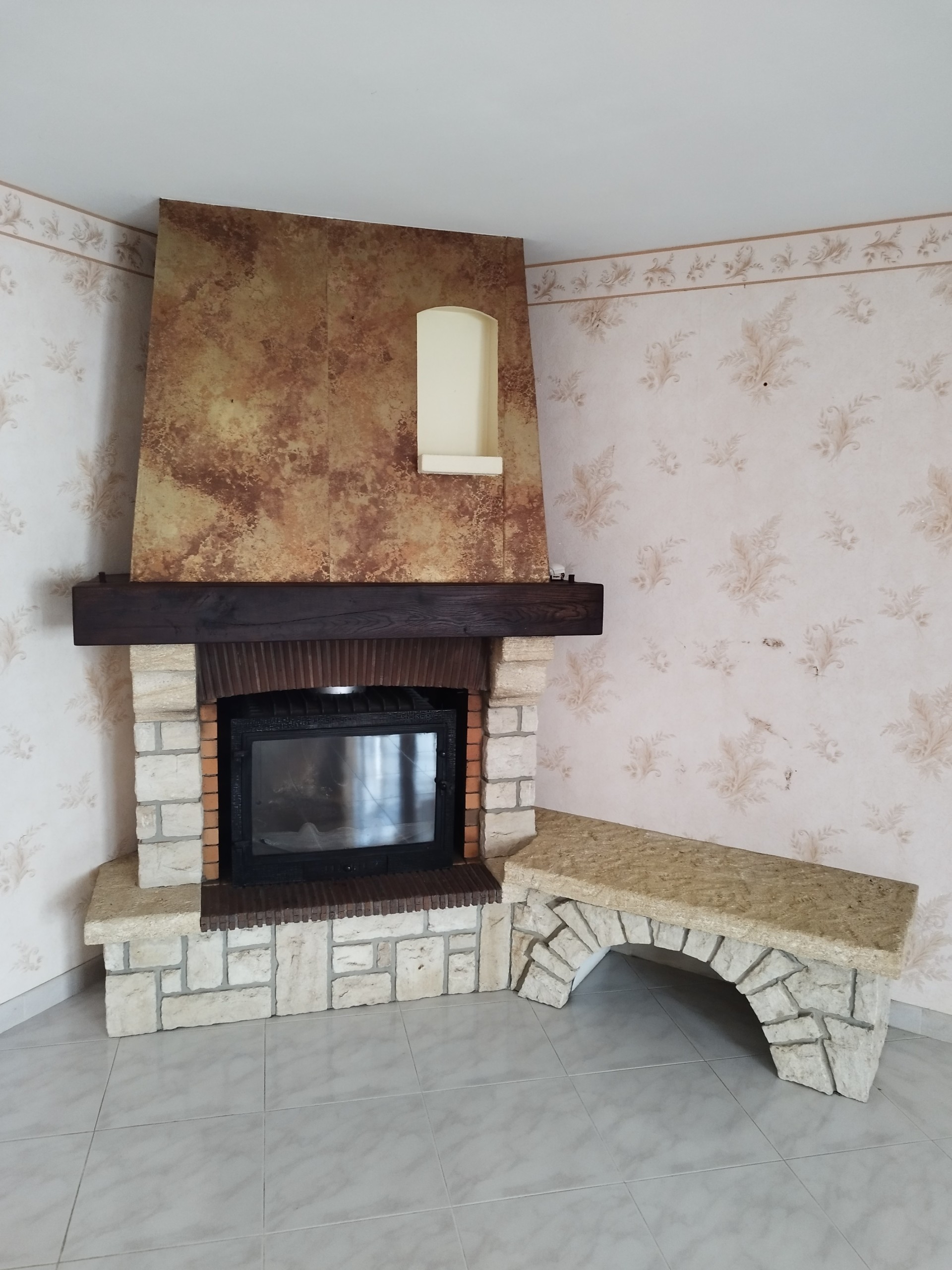 Elle se compose d'une entrée ouvrant sur une pièce de vie attenante à une cuisine aménagée; d' une grande pièce salon/salle à manger avec une cheminée à insert.