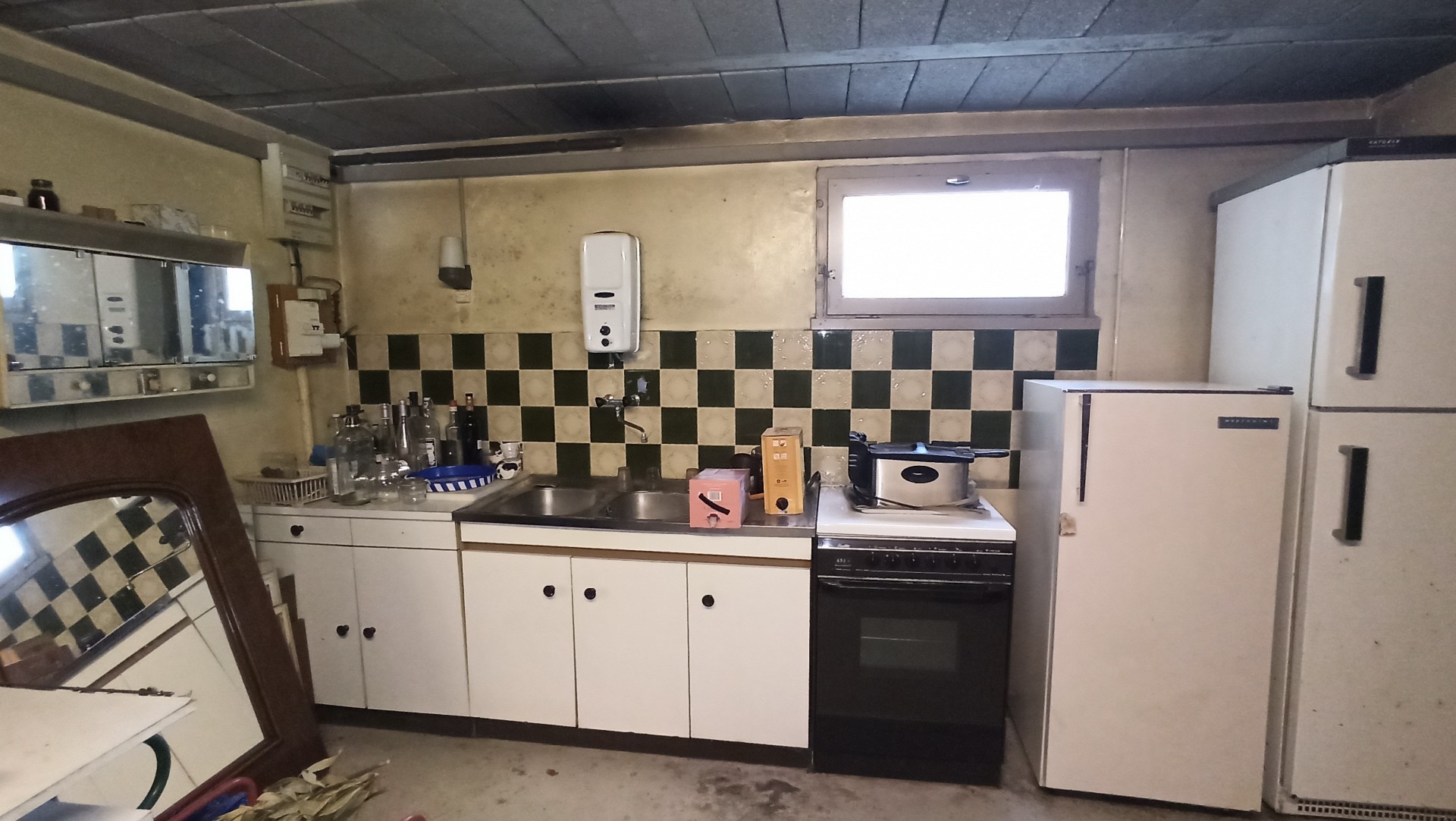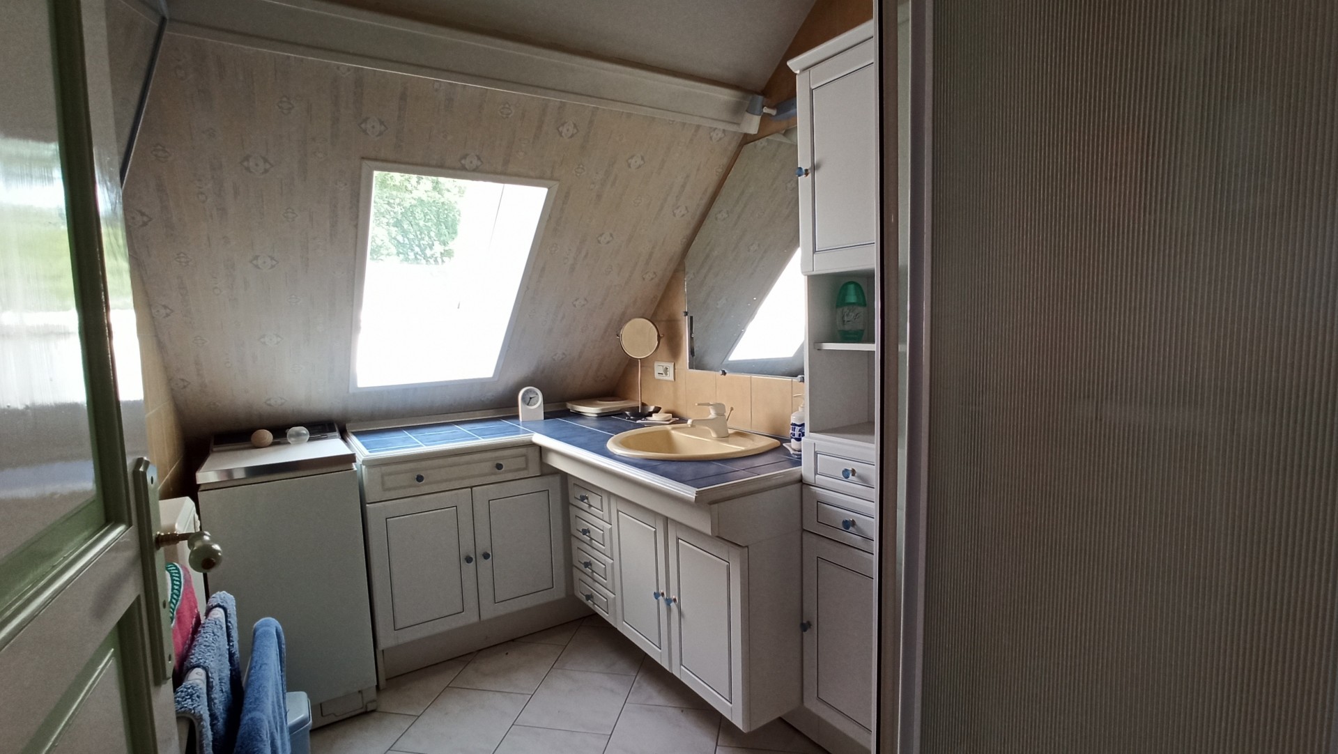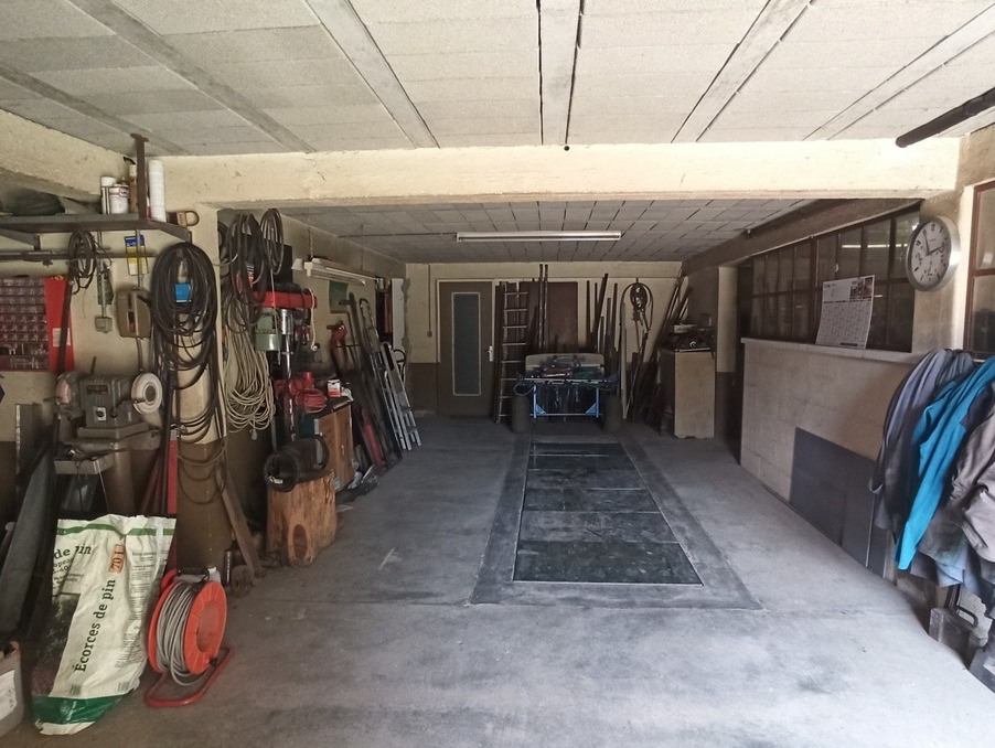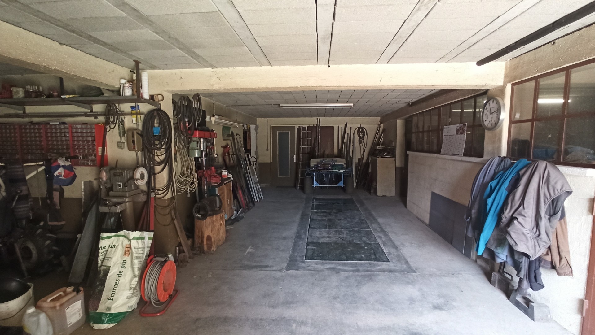 Un dégagement avec placard mural desservant : un garage de 47.3 m² équipé en 380 volts avec fosse, un atelier de 18 m² un cellier de 22.3 m², une cave de 17 m², une grande cuisine d'été de 38 m² et une salle d'eau avec WC de 3.5 m².