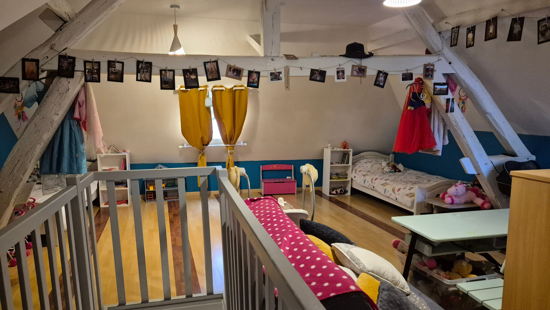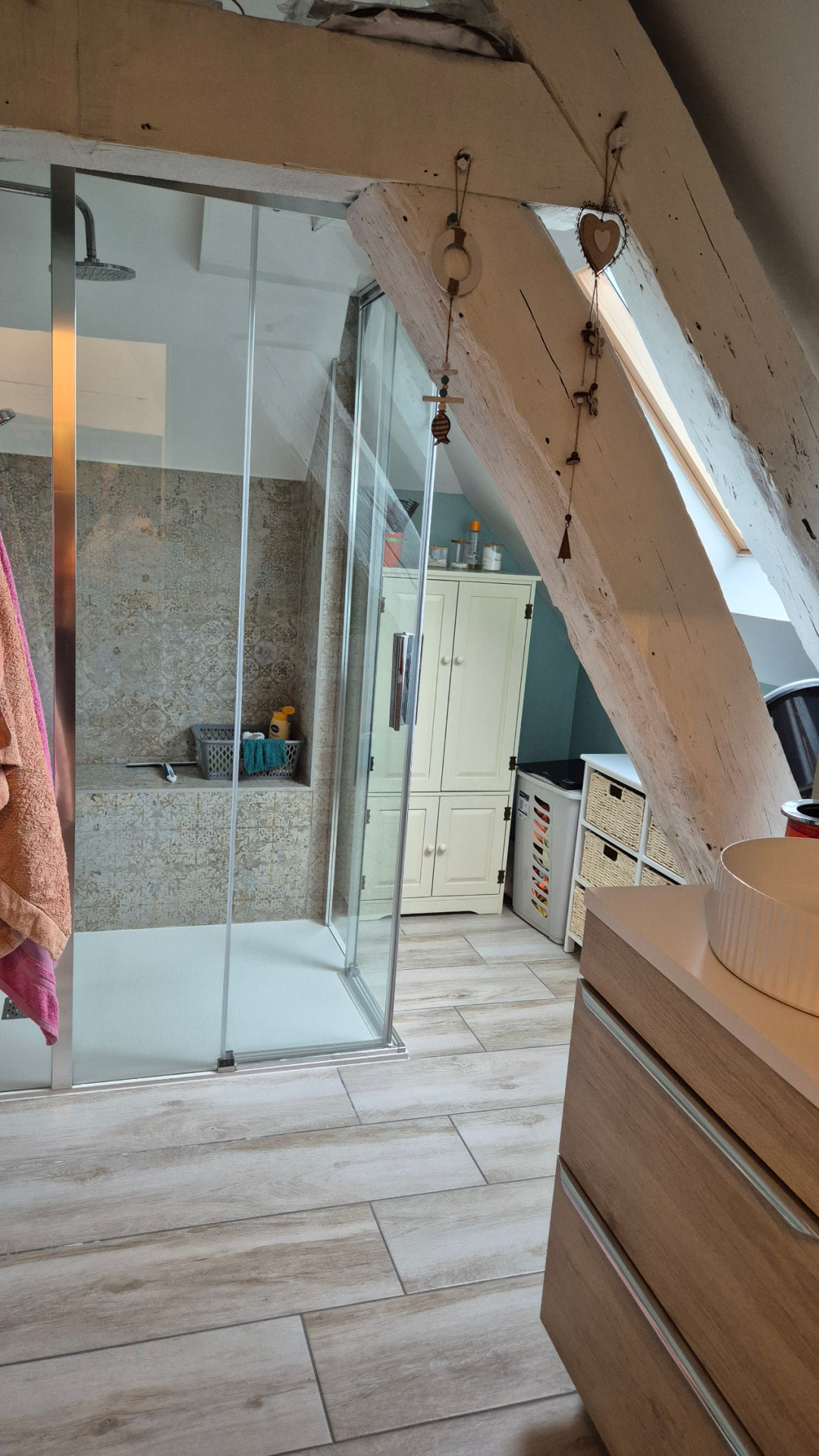 L?étage est dédié au repos, avec deux chambres dont une aux beaux volumes avec poutres apparentes, une salle de bain avec douche, un WC et un débarras offrant un espace de rangement.