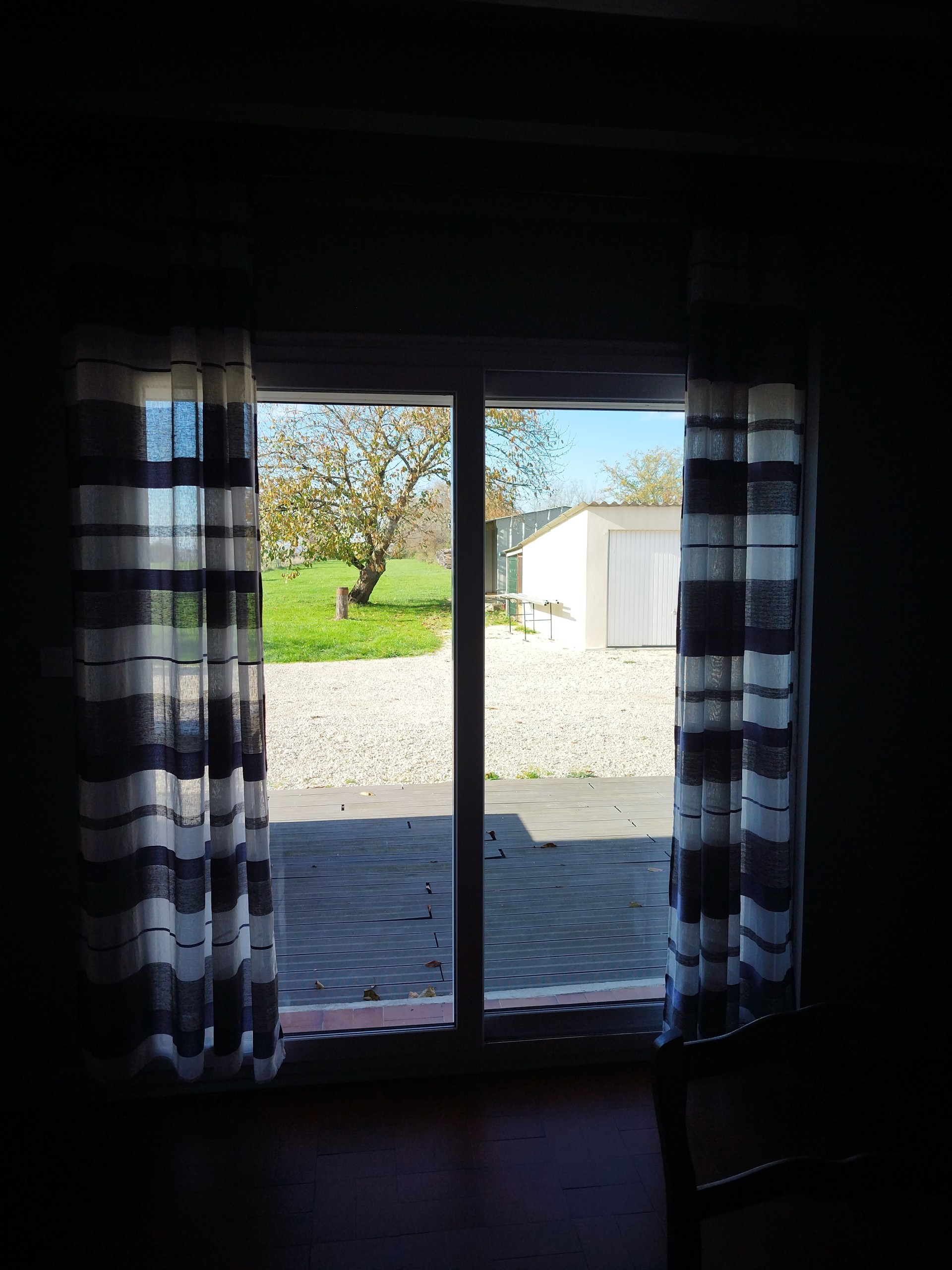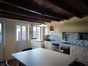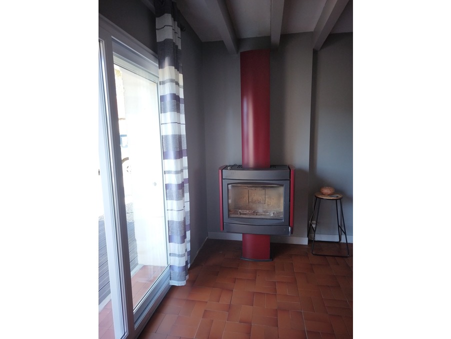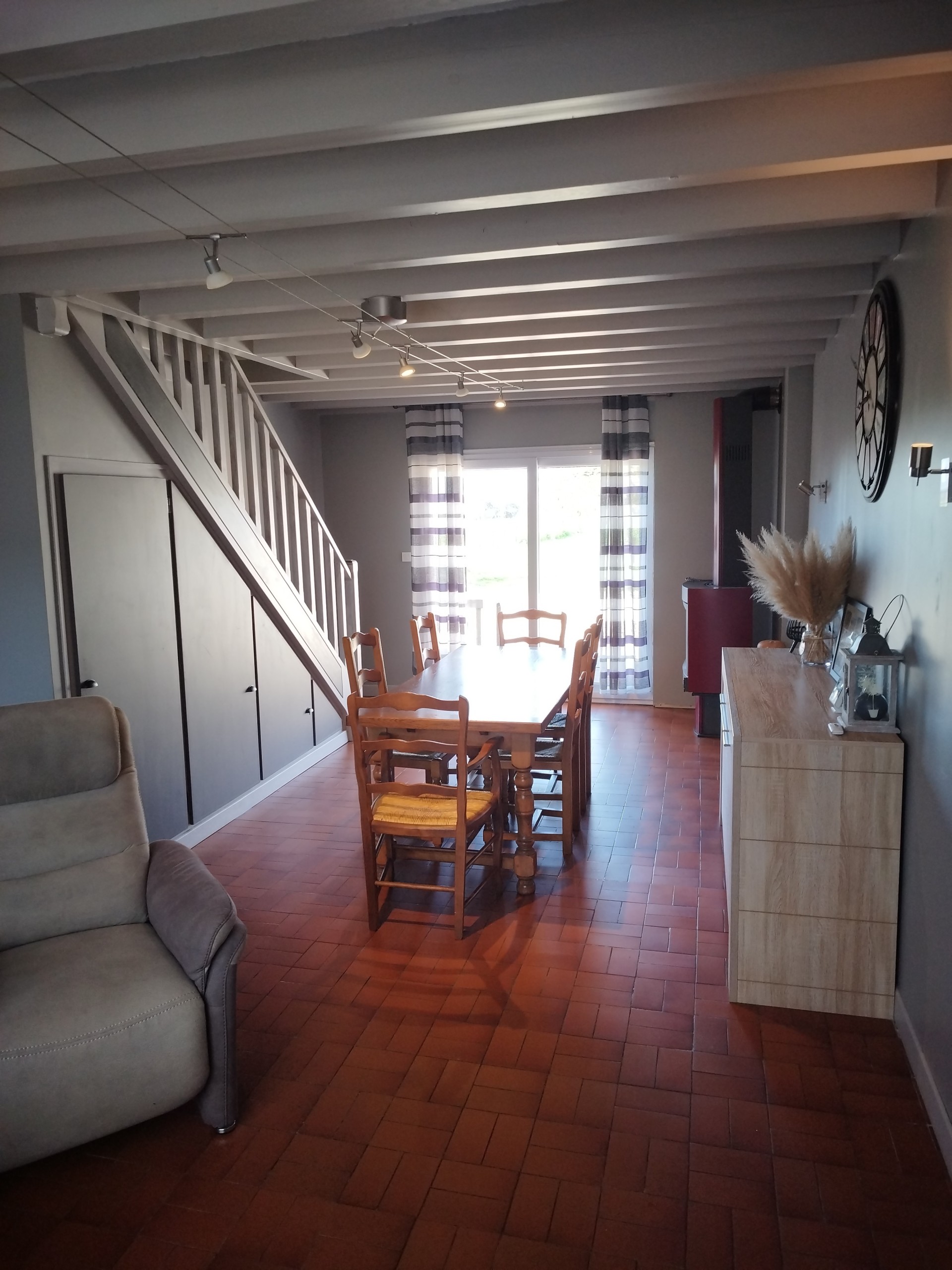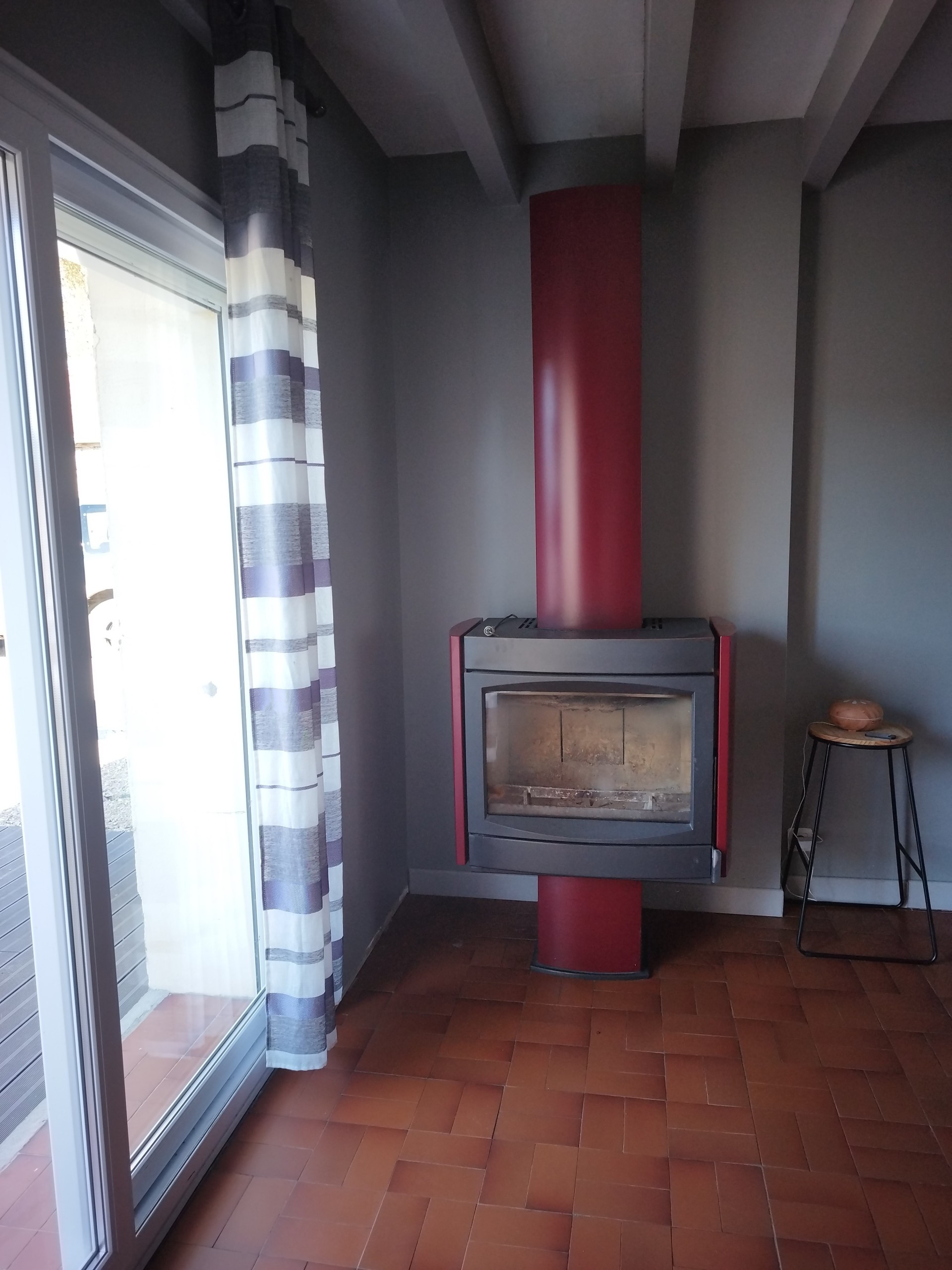 Elle est composée au rez de chaussée, d'une grande cuisine équipée, d'une pièce à vivre salon/séjour dont les fenêtres en PVC sont équipées de volets roulants solaires, et d'un poêle à bois, le tout donnant accès à une terrasse côté jardin.