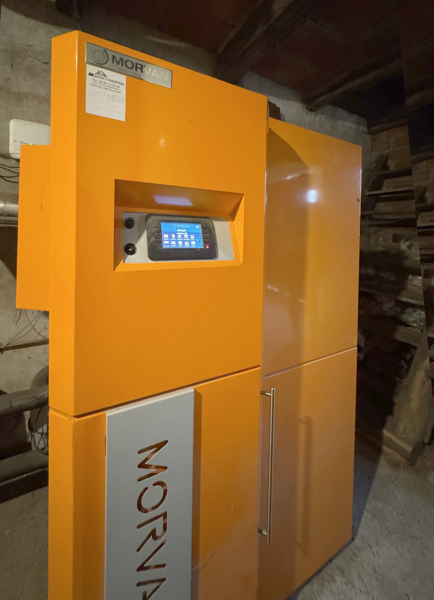 Elle comprend un couloir desservant une cuisine dînatoire semi-ouverte sur un séjour, deux chambres, une salle de bain et un WC. Dans le prolongement de la partie habitable de la maison, le corps du bâtiment dispose d'un double garage traversant qui est contiguë avec un débarras et une grande chaufferie. Dans celle-ci a été installée fin 2019, pour le chauffage central, une chaudière à combustible granulé, très hautes performances de dernière génération de la marque française réputée MORVAN. Depuis cette chaufferie, on peut accéder, par un escalier de type échelle de meunier, aux combles disposant d'une superbe poutraison ancienne. On pourrait envisager leur aménagement, mais pour l'heure, ils permettent de constater qu'une épaisseur de laine de roche de 30 cm isole les plafonds de l'habitation. Un cumulus de 200 litres, installé récemment, assure la production d?eau chaude.
