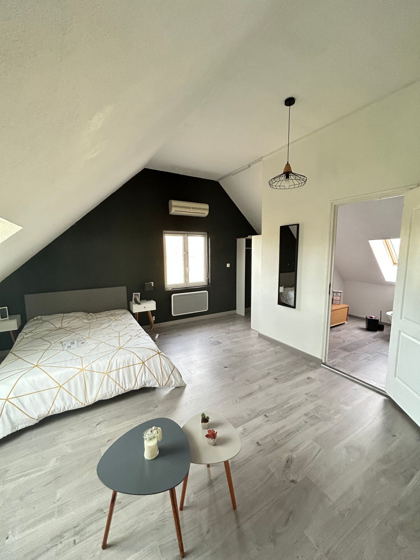 Au rez de chaussée : une entrée avec placard mural, deux chambres (9 m² et 14 m²) équipée de placards muraux, une cuisine équipée de 10,45 m² ouverte sur un lumineux séjour de 21,92 m² et une salle de bains de 4,15 m². A l'étage : une mezzanine de 12 m² équipée d'une climatisation réversible dessert une chambre de 11 m² et une suite parentale (dressing, salle d'eau avec WC) avec une climatisation réversible.