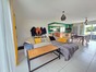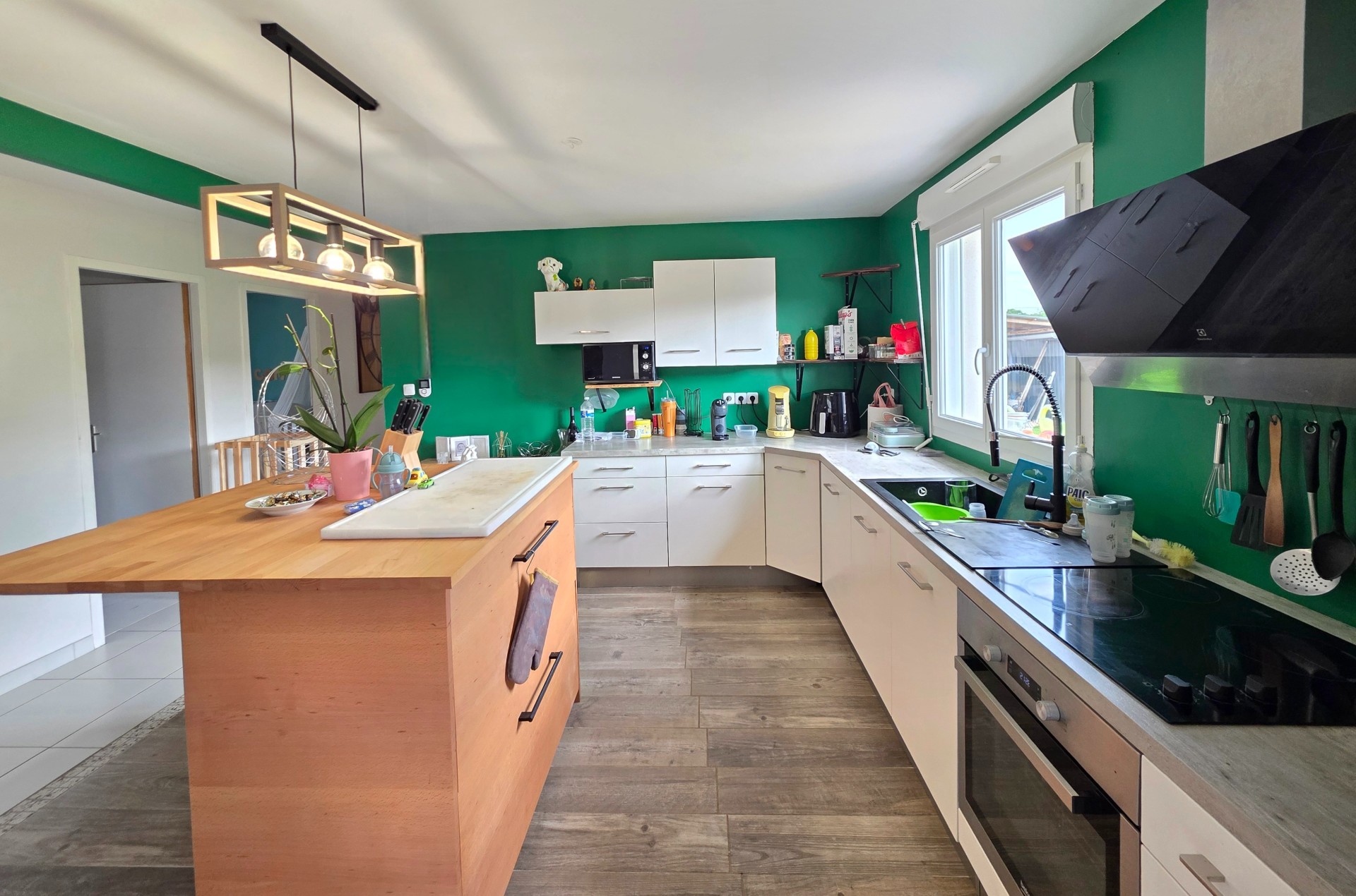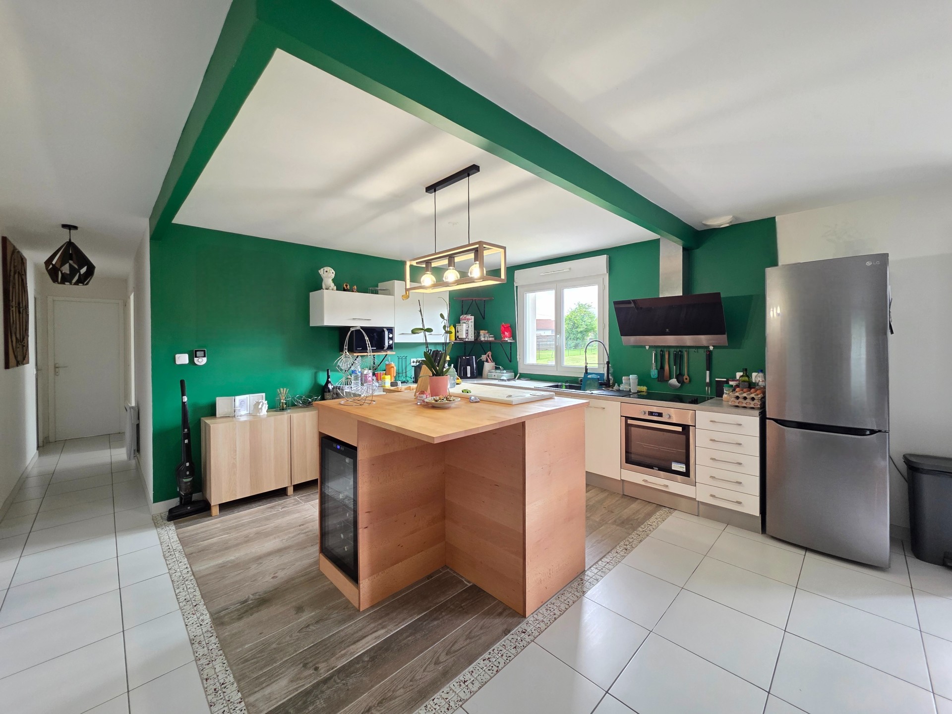 Dès l'entrée, vous serez séduit par la pièce de vie lumineuse de plus de 44 m², traversante Est-Ouest, qui offre une belle circulation de lumière naturelle tout au long de la journée. La cuisine ouverte, entièrement équipée, est à la fois fonctionnelle et conviviale avec son îlot central, idéale pour partager des moments en famille ou entre amis. Le salon-séjour donne directement accès à l'extérieur, avec une grande terrasse offrant une vue dégagée sur le jardin. Le poêle à pellets vient compléter l'ensemble en apportant une touche chaleureuse à l'espace de vie.