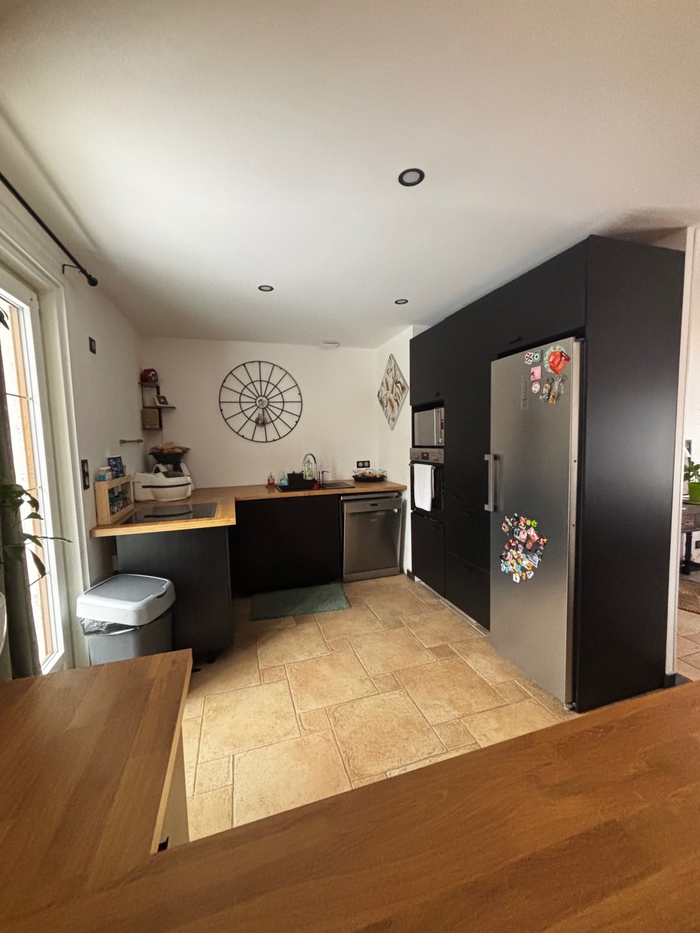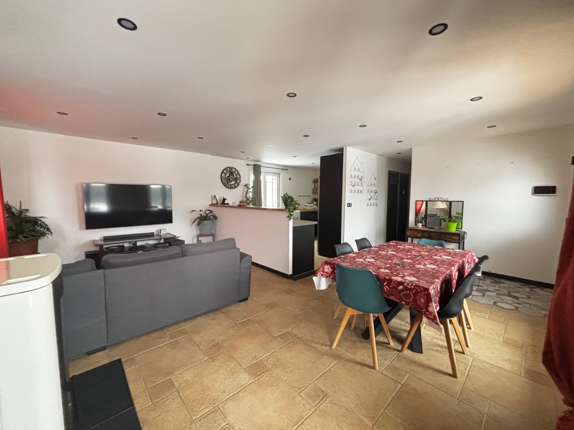 Elle se compose d'une cuisine récente meublée et entièrement équipée ouverte sur un séjour salon lumineux de 30m², agrémenté d'un poêle à granulés pour un confort optimal.