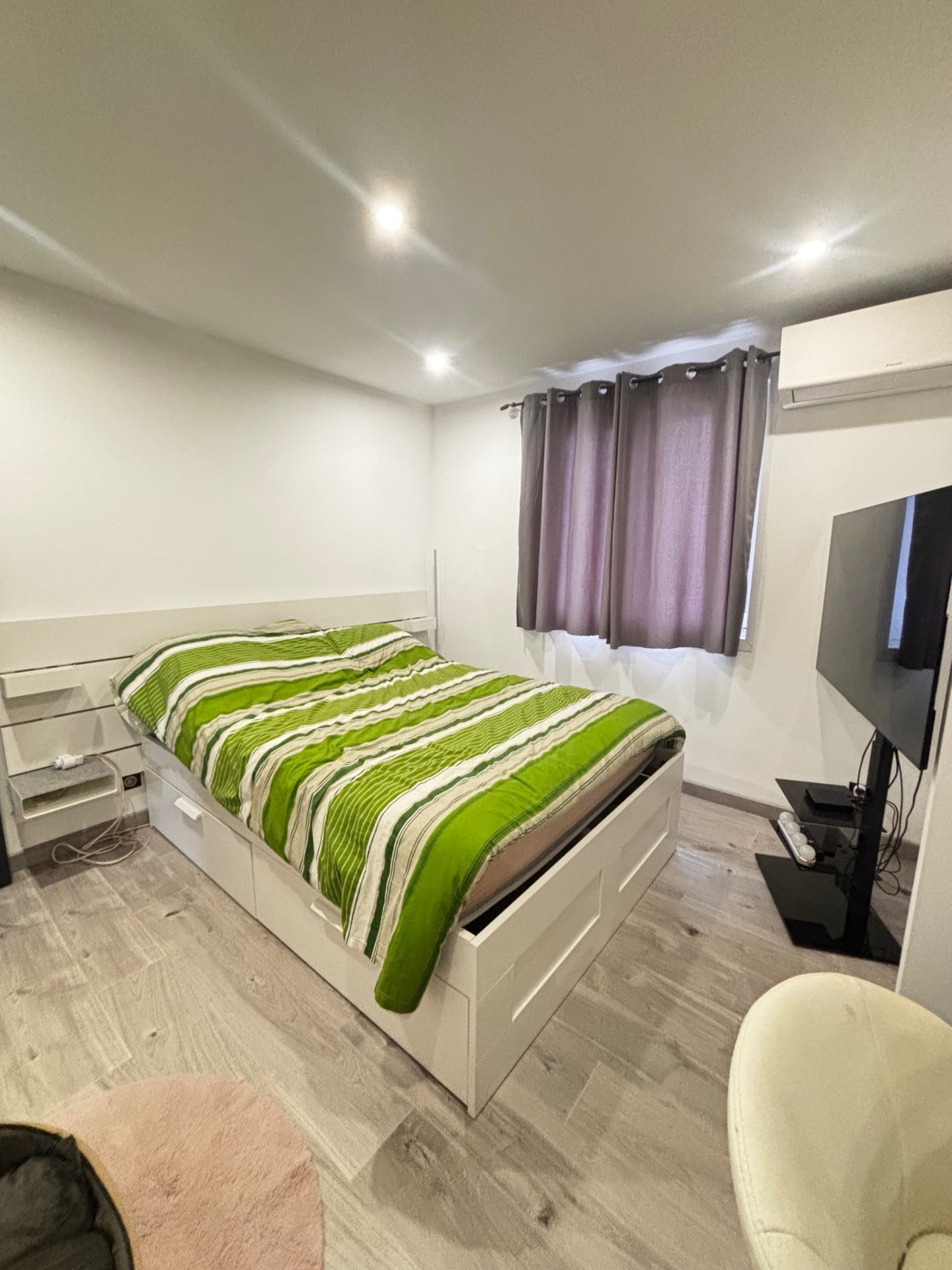 La partie nuit comprend trois chambres (11.92, 9, 9.68) dont deux équipées de climatisation réversible, une salle d'eau, un WC indépendant, rangements.