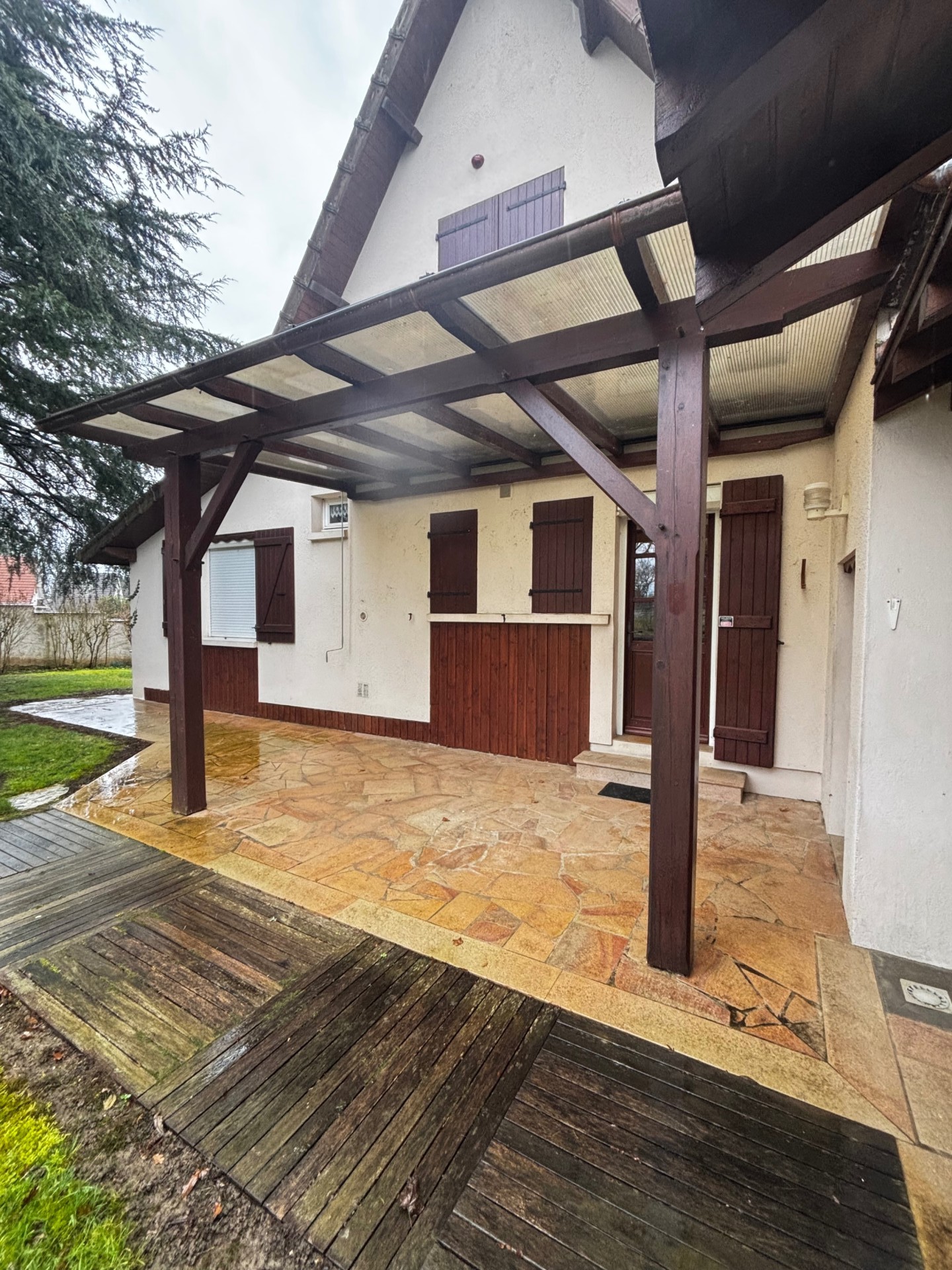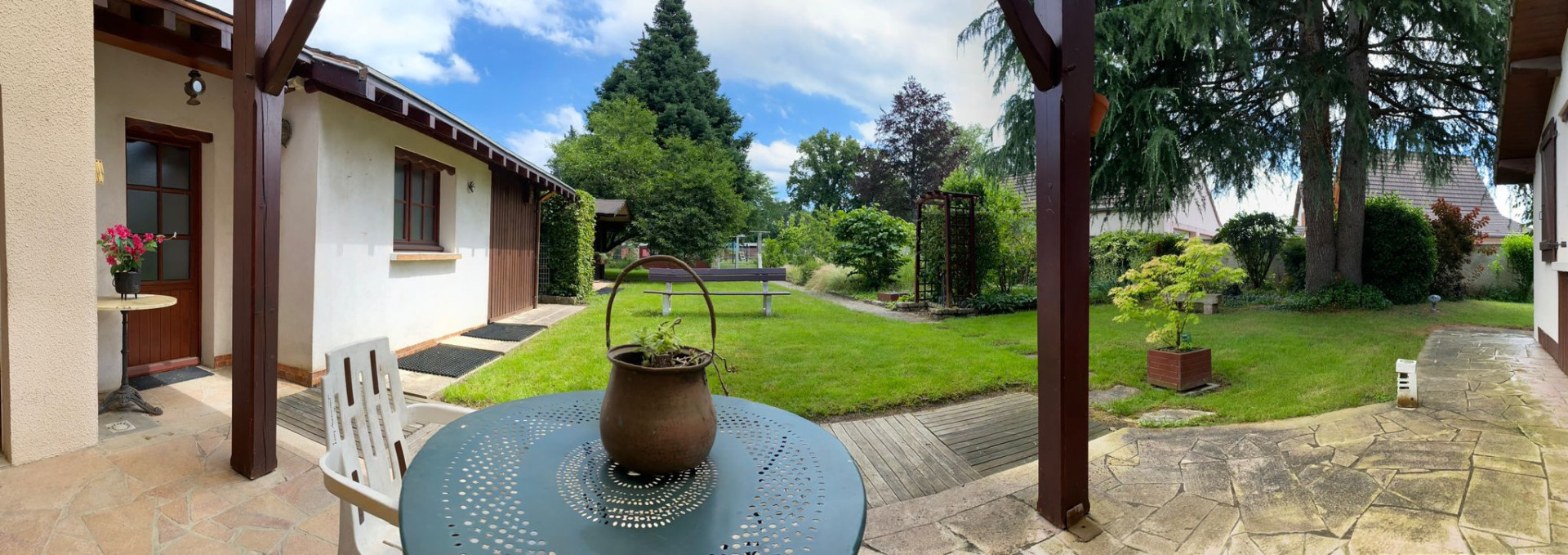 A l'extérieur, vous profiterez d'un beau terrain clos et arboré de 762 m² avec une belle terrasse couverte, idéal pour les moments de détente en famille.