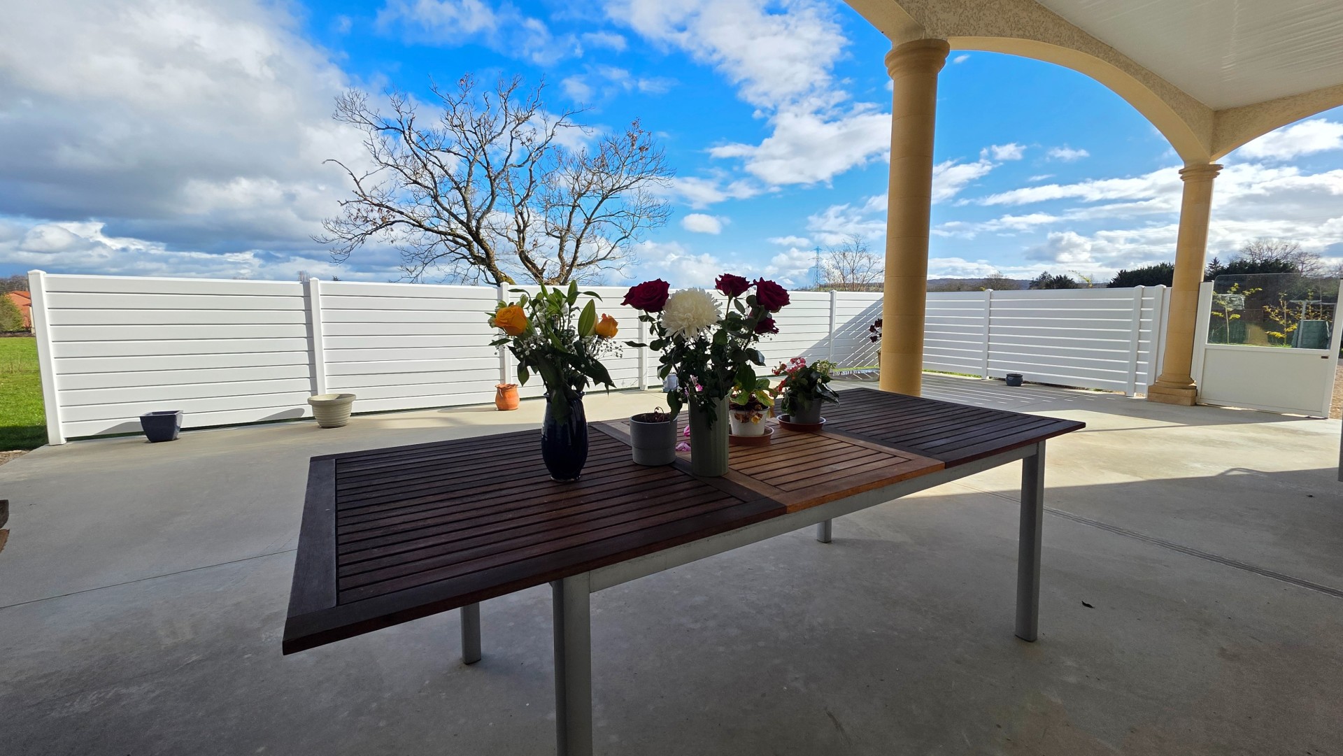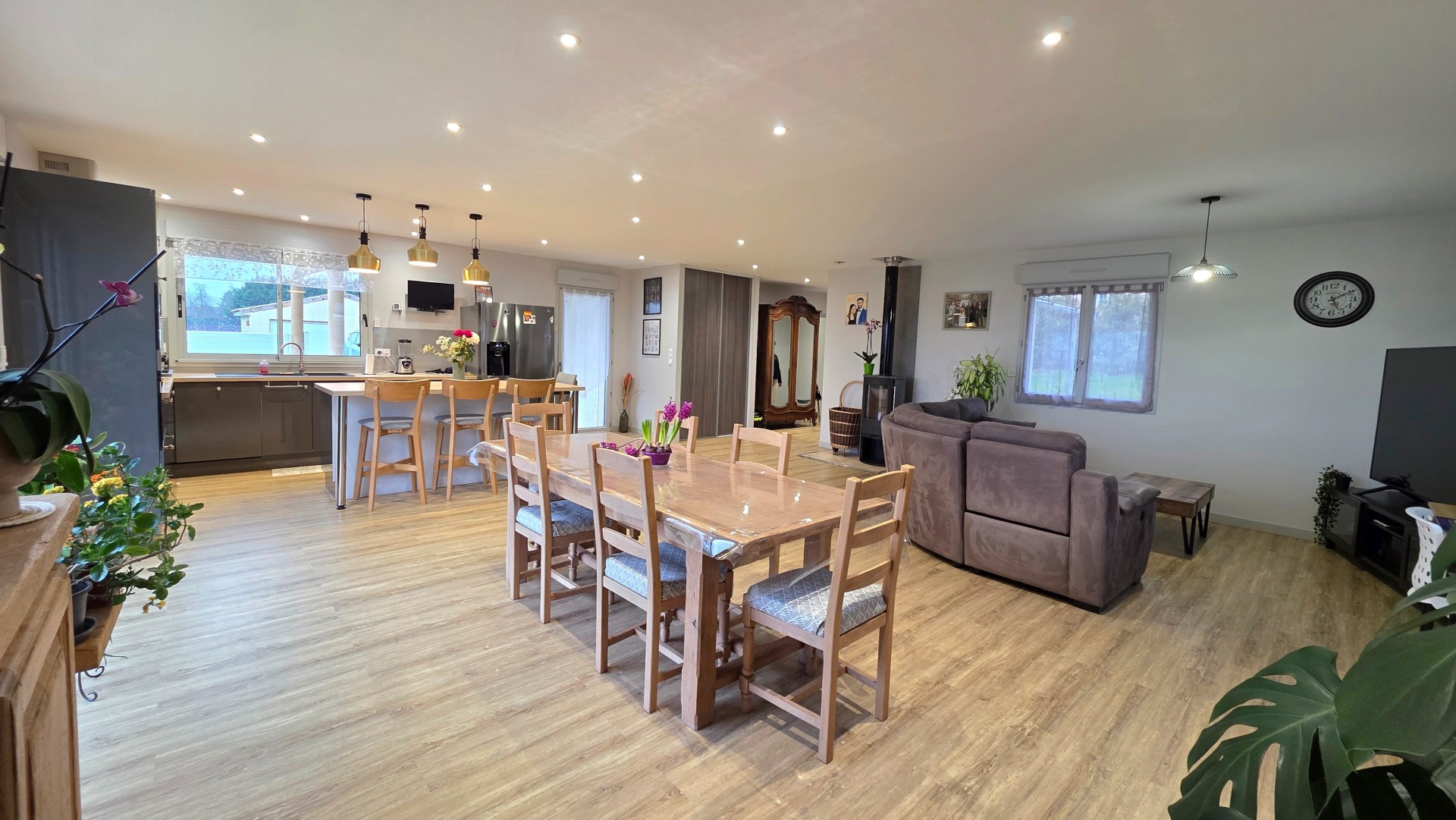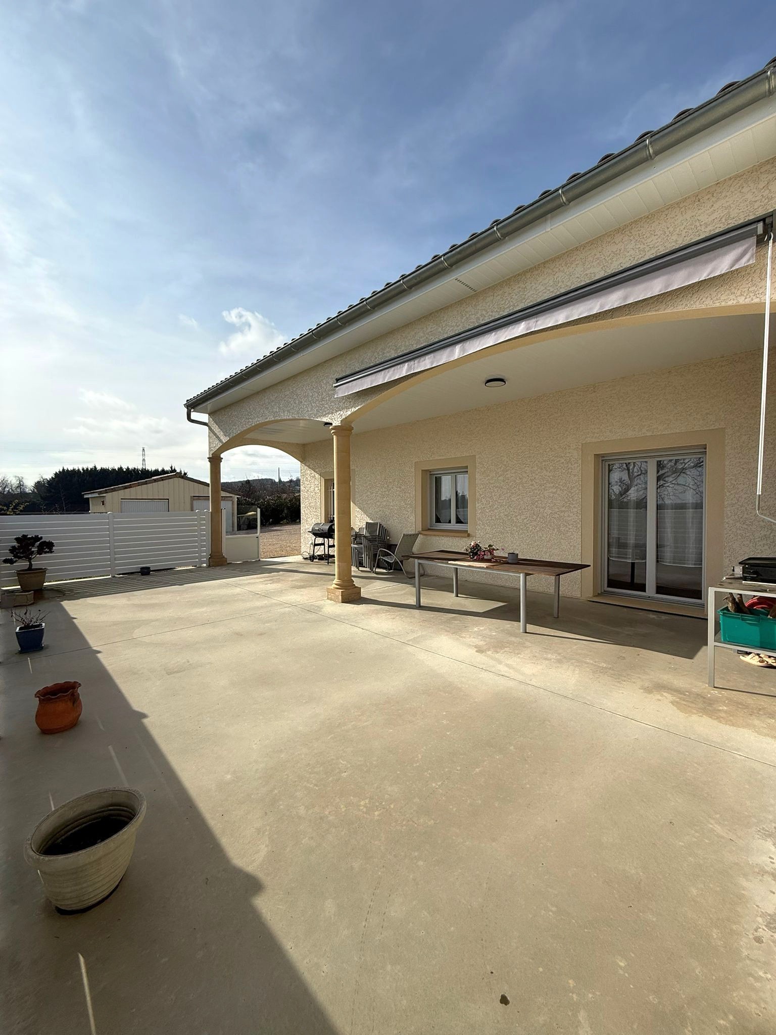 L'espace de vie s'ouvre naturellement sur une magnifique terrasse semi-couverte d'environ 60 m², idéale pour recevoir et profiter des extérieurs.